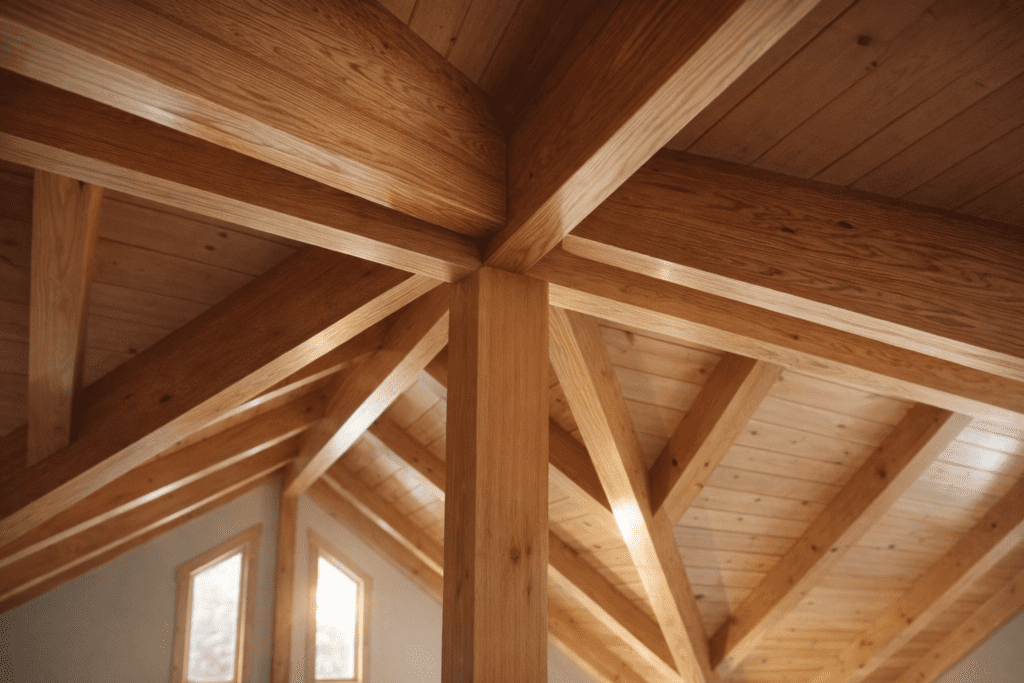 경량목구조가 비교적 가는 부재와 벽체 중심으로 구성된다면, 중목구조는 큰 단면의 목재를 활용해 기둥과 보가 중심이 됩니다.